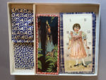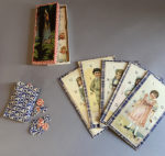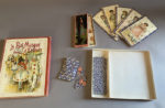 garçons et 3 filles) et 6 autres représentant des personnages connus (le Chaperon rouge, le Prince charmant, la Jardinière, le Ramoneur, Pierrot et Pierrette), chacune d’elles découpée en dix morceaux à recomposer, 16 jetons rouge et 9 jetons bleu en carton. Très charmant jeu de loto. Règle du jeu au verso du couvercle.