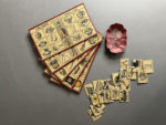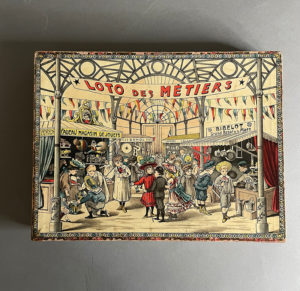 échoppes de marchands et chalands) ; intérieur compartimenté en deux parties dans lesquelles sont rangés 6 cartons de loto au format oblong, un sac de 72 petits cartons numérotés représentant des objets ou des fruits, une corbeille en carton, et 15 jetons en verre blanc dans une bourse en tissu. Beau jeu Saussine sur le thème des métiers. Chaque carton de loto est consacré à une activité commerciale précise avec la représentation du commerçant et des objets qu’il vend : bijoutiers, fruitier, instruments de musique, cristaux et porcelaine, bazar de la place, et magasin de jouets. Règle du jeu collée au verso du couvercle.