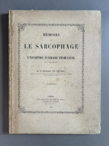 Monographie sur le sarcophage d’Eshmounazor II, roi des Sidoniens, découvert en 1855 par le duc de Luynes (1802-1867) dans une ancienne nécropole près de Sidon au Liban. Le sarcophage est aujourd’hui conservé au Louvre. Restaurations au cartonnage, piqûres sur les plats.