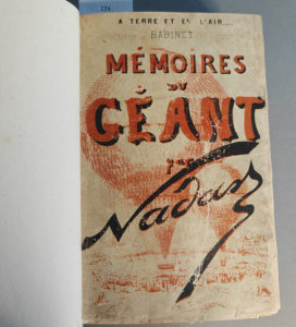 moderne). Édition originale. Édition originale. (Tissandier, p. 30). Histoire fascinante du Géant, l’immense ballon de 40 mètres de haut construit par Nadar en 1863 et dont l’ascension inaugurale eut lieu en octobre de la même année devant 200 000 spectateurs. Un des rares exemplaires sur hollande. Couverture fanée et restaurée.