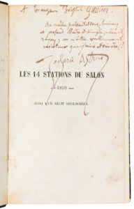 Zacharie Astruc (1833-1907), critique d’art, poète, collectionneur, peintre et sculpteur, fut un ardent défenseur de Delacroix, de Courbet et de Manet. Exemplaire de Théophile Gautier, avec ce très bel envoi signé de l’auteur sur le faux-titre : ÀMonsieur Théophile Gautier. Au maître puissant et doux, lumineux et profond, illustre et simple, - âme et rayon ; au maître excellemment créateur que j'aime et vénère ! ZacharieAstruc. Des bibliothèques Hubert Heilbronn et Julien Bogousslavsky (ex-libris). - Quelques rousseurs, dos légèrement éclairci.
