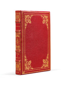 bordure centrale, gardes de reps rouge foncé, tranches dorées sur témoins, couverture et dos, étui (Durvand). Couverture illustrée et 35 compositions par A. Robaudi, gravées à l’eau-forte au burin par Henri Manesse. Tirage à 300 exemplaires, celui-ci sur vélin du Marais.