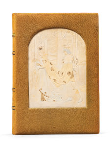 BANVILLE (Théodore). Les Princesses. Paris, F. Ferroud, 1904. Grand in-8, maroquin vert mousse, serti dans le premier plat pièce en plein cintre de veau blanc décoré d’une scène en bas-relief (une reine accompagnée d’un valet portant sa...
