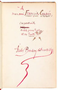 Édition originale. Envoi signé de l’auteur à son ami François Coppée, ces portraits trait pour traits pour traits… et ces traits. Celui-ci est répertorié par Bonnefon dans Les Dédicaces à la main de Jules Barbey d’Aurevilly, p. 123.