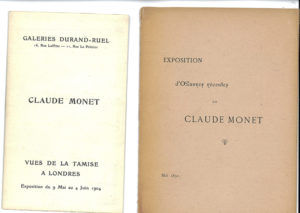 reproductions de tableaux (un fac-similé et 8 phototypies). Exemplaire sur japon ancien, celui-ci non numéroté (tirage de luxe à 100 exemplaires). — Exposition Claude Monet. Paris, Galeries Durand-Ruel, mai 1891. Plaquette in-12, brochée. — Claude Monet. Vues de la Tamise à Londres. Paris, Galeries Durand-Ruel, 1904. Plaquette petit in-12, brochée.