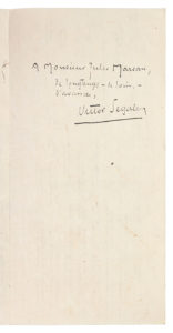 exemplaires sur papier impérial de Corée, non mis dans le commerce. Envoi signé de Victor Segalen àMonsieur Jules Marsan,de longtemps - de loin, - d’avance. Jules Marsan (1867-1939) collectionnait particulièrement les lettres de Nerval. Petites mouillures sur le premier plat du volume.