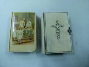 petits clous, dos arrondi muet, tranches dorées, fermoir en métal, [Rel. de l'époque]. Un cahier partiellement déboïté. Belle reliure en ivoire, bien conservée.— JOINT : Paroissien romain, contenant l'office des principales fêtes et les épïtres et les évangiles de tous les dimanches. Turnhout, Brepols, 1920 ; in-24, reliure à plats rapportés en bakélite imitation ivoire, scène liturgique chromolithographiée sur le premier plat, dos arrondi muet, tranches dorées. Un cahier partiellement déboïté, coins du plats inf. frottés