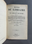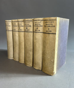 BIBLIOGRAPHIE. — BRUNET. Manuel du libraire et de l’amateur de livres. Berlin, Fraenkel& Cie, J. Altmann, 1921. 6 volumes in-8, bradel demi-vélin avec petits coins, dos lisse (Reliure de l’éditeur). Reproduction en fac-similé de la 5e...
