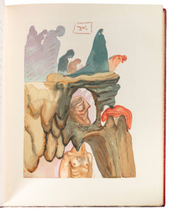 d’or). Superbe édition illustrée par Salvador Dali, ornée de 100 planches à pleine page d’après les aquarelles de l’artiste, gravées sur bois et imprimées en couleurs. Un des exemplaires sur pur chiffon de Rives. Un des feuillets reliés de la justification est imprimé au nom de Jean Estrade, directeur des Éditions Les Heures claires, d'autres sont joints, volants.