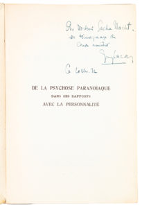 l’auteur n’est pas suivi de son titre de Chef de clinique de la Faculté de Médecine de Paris sur la couverture, ni sur le titre. Thèse de doctorat soutenue à la faculté de médecine de Paris le 7 septembre 1932 par Jacques Lacan (1901-1981), célèbre psychiatre et psychanalyste français : ce dernier y étudie le délire systématique de persécution à travers le cas d’Aimée, alias Marguerite Anzieu (1892-1981), internée à l’hôpital Sainte-Anne pour avoir tenté d’assassiner une actrice en avril 1931. Exemplaire portant un envoi de l’auteur à son collègue de la SFP, le psychanalyste roumain Sacha Nacht (1901-1977).