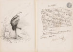 P.A.S. par Albert WOLFF, Au Vautour !, apostrophant le vautour ramené d’Afrique par Alexandre Dumas et évoquant le « grand romancier qui a écrit au Pavillon Henri IV Les Mousquetaires et Monte Christo »… – En regard, dessin représentant le vautour avec les armoiries de Saint-Germain-en-Laye, encre de Chine, signé « Th. Darros Lecourt » (?), daté Novembre 1889.