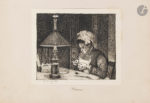 Dessin par François BONVIN : femme travaillant sous la lampe, signé et daté 1883, plume et encre de Chine (14,5 x 17 cm).