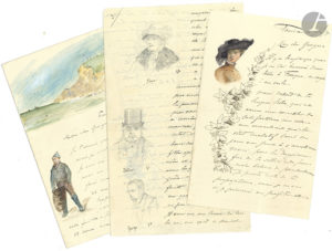 D’amusants dessins illustrent les lettres : soldat, musiciens, bébés au biberon, Coquelin, personnages, autoportrait en pendu, paysage aquarellé du Havre, personnages de Nana de Zola, balayeur, Paris sous la neige, tambour-major, Pierrot, sapeur-pompier, lancier, moulin de la Galette, etc.