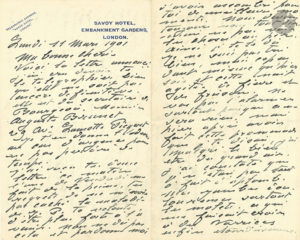 Claude MONET. L.A. (la fin manque), Londres 11 mars 1901, à sa femme Alice ; 4 pages in-8 à en-tête Savoy Hotel, Embankment Gardens, London.