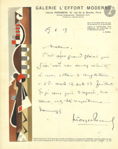 Léonce ROSENBERG (1879-1947). L.A.S., 25 juin 1919, à une dame ; 1 page in-4 à en-tête de sa Galerie L’Effort moderne.