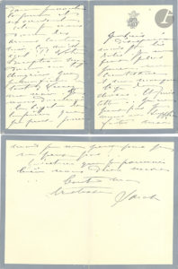 Sarah BERNHARDT (1844-1923). L.A.S. « Sarah », [1908 ?], à Paul Bilhaud ; 6 pages in-8 à ses chiffre, devise Quand même et masque, enveloppe.