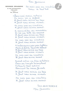 Georges BRASSENS (1921-1981). Manuscrit autographe signé, Ne crois pas au cimetière, Poème de Paul Fort, Paris 14 décembre 1978 ; 1 page petit in-fol. à son en-tête.