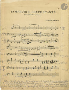 Georges ENESCO (1881-1955). Épreuves avec corrections et additions autographes et P.A.S., Symphonie concertante pour violoncelle et orchestre op.8, [1906 ?] ; 27 pages in-fol.