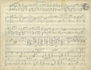 Le manuscrit de la version chant et piano, à l’encre noire (parfois sur une esquisse au crayon) sur papier oblong à 16 lignes, a servi pour l’édition. Il présente des ratures et corrections, et des annotations de nuances au crayon bleu, ainsi que quelques indications d’instrumentation au crayon. Les feuillets portent une double numérotation, par acte et générale.
