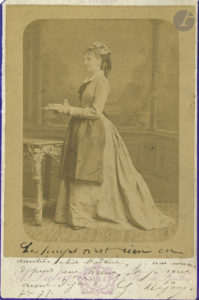 Photographie de Réjane à ses débuts par A. Liébert (16,5 x 11 cm), avec cet envoi : « Le temps n’est rien en amitié, chère Madame, je vous connais depuis une...