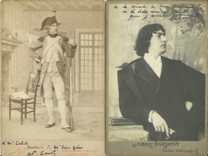 Lefebvre dans Madame Sans-Gêne), Albert Darmont (2, dont une dédic. à Ernest d’Hervilly avec poème), Edmond Duquesne (en Napoléon dans Madame Sans-Gêne, 1893), Félix Galipaux (par Nadar, 1892), Philippe Garnier (par Nadar, en Justinien dans Théodora, dédic. à Raoul Ponchon), Marie Laurent (par Nadar, en Lucrèce Borgia, dédic. au dos à Dumaine, 1877), Paul Mounet (dédic. à Françoise Sylviac), Jules Truffier (par Nadar, dédic. à Ernest d’Hervilly, 1896).