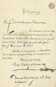 Jules BARBEY D’AUREVILLY (1808-1889). L.A.S., 30 décembre 1879, à M. Hannoteau ; 1 page in-8.