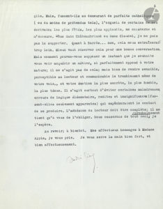 dactylographiée. Il se réjouit de renouer avec Dabit, ayant « beaucoup souffert de ce croquemitaine que votre imagination trop sensible s’était ingéniée à dresser entre nous […] Et je n’osais vous récrire, craignant par quelque nouvelle imprudence d’aggraver votre alarme… Et je mesurais la profondeur de mon affection pour vous, déjà vieille, au chagrin que je ressentais d’avoir perdu la vôtre. […] Notre amitié, d’ordre tout mystique, exige un ciel tout pur ». Gide peine à croire que sa parole « si maladroite, si insuffisante, dont je suis si peu maître dans la conversation, et qui si souvent trahit mes sentiments et ma pensée, que cette parole puisse être d’un réconfort plus grand que mes livres où je tâche de projeter ce que je sens en moi de plus important, de meilleur ». Il n’a pas la même conception du talent : il partage « votre horreur du talent factice, postiche et surajouté ; de la parure, du fard, du masque, fût-il d’or ou de pierreries », et il « repousse de plus en plus tout faire-valoir inutile, toute virtuosité », et tend « à une expression toujours plus pure, plus simple et plus dénuée d’artifices de mes sentiments et de ma pensée ». Cela exige un talent supérieur et une simplicité qui reflète « des vertus profondes, parentes de celles que nous enseigne l’Évangile. Mais fussent-ils au demeurant de parfaits catholiques (ou du moins de prétendus tels), l’orgueil de certains de nos écrivains les plus fêtés, les plus applaudis, me consterne et m’écoeure… ; même dans Chateaubriand ou dans Claudel, je ne puis pas le supporter. Quant à Barrès… non, cela nous entrainerait trop loin »…