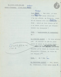 Sacha GUITRY (1885-1957). Tapuscrit avec corrections et additions autographes pour Si Paris nous était conté, [1955] ; 38 pages in-4 sur papier bleu.