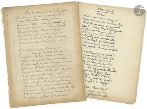 références bibliographiques et une liste de titres (Les Clameurs semble un titre général ; les autres doivent être des titres de poèmes : Fleurs de boulevard, Coquetterie de la terre, etc.). Pour la patrie ! (à mon ami Georges Godde) et Enamorado daté « 15 Août 72 » semblent les plus anciens (de la même époque, deux feuillets de plan d’une tragédie Régulus ou La Patrie en danger). Entre cocus a paru dans le Parnasse satirique du XIXe siècle (Kistemaeckers 1881). D’une même série, semblent venir des poèmes écrits sur le même papier cartonné jaune (plus deux fins de poèmes dont le début manque) : Les deux Jean, Les joueurs d’orgue, Tableau d’histoire (en double), L’erreur, Au cabaret, Dans la vallée, Pochade, La mouche (en double), Conclusion. Enfin, Pour la Denise, Le retour du prodigue (paru dans L’Artiste en 1878), Dans la ruelle de Cydalise, Jardin magique. Ces poèmes, inédits en volume, ont parfois paru dans des revues (coupures jointes).