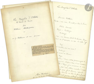 On joint le manuscrit autographe complet d’une première version de cet Othello, 163 pages petit in-4 (20,5 x 16 cm) avec ratures et corrections, classées sous 7 chemises avec pagination par tableau : Acte I, 1er tableau (14 p.), 2e tableau (16 p.) ; Acte II (30 p.) ; Acte III (38 p.) ; Acte IV (40 p.) ; Acte V, 1er tableau (7 p.), 2e tableau (18 p.).