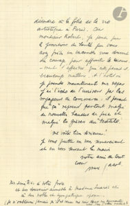est temps de penser au Terrain Bouchaballe, et il aimerait profiter de son passage à Paris pour faire le service de presse. « Il commence à faire ici très froid mais les avantages de la solitude compensent le vent de la Loire qui est violent et glacé et l’obscurité d’un village sans réverbères. Tout plutôt que le désordre et la folie de la vie artistique à Paris. […] À l’hôtel où je prends maintenant mes repas j’ai l’écho de l’univers par les voyageurs de commerce : il paraît que “ça” reprend partout malgré de nouvelles hausses de prix et malgré les grèves du “textile” »… Il salue le « noble et sympathique » André Suarès…