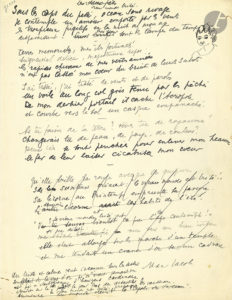Manuscrit de travail avec ratures et corrections, et en partie biffé, de ce poème recueilli dans L’Homme de cristal (1967, p. 23).