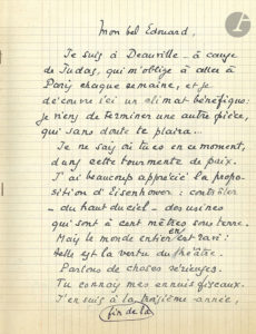 8 août 1955. Il remercie son cher Édouard de sa cravate (de commandeur de la Légion d’honneur) « que tu as nouée toi-même autour de mon col ». Alors que le dernier acte de sa « longue aventure fiscale » va se jouer, il prie de ne pas montrer à l’administration le résumé ci-dessus, qui « pourrait irriter ces puissants chefs »…