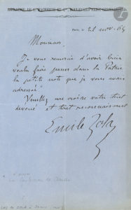 Émile ZOLA (1840-1902). L.A.S., 21 novembre 1865 ; demi-page in-8 à en-tête (biffé) de la Librairie de L. Hachette.