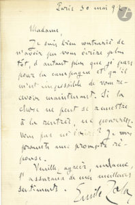 Il part à la campagne et regrette de ne pouvoir la recevoir. « Si la chose ne peut se remettre à la rentrée, ne pourriez-vous pas m’écrire ? Je vous promets une...