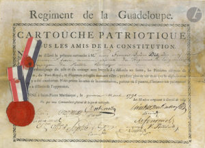 Garde nationale, délivré pour avoir défendu « les Patriotes de Saint-Pierre, du Fort-Royal, et Planteurs réfugiés dans ces villes, pendant plus de six mois que la régénération française y a été combattue » (in-4 oblong impr. sur parchemin, sceau de cire rouge de l’Hôtel de Ville de St Pierre et ruban tricolore).