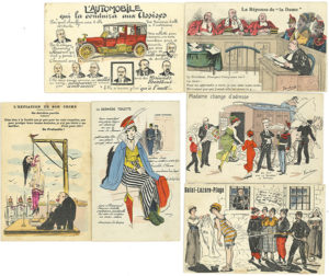 Cartes postales satiriques (2 en double) en couleurs sur le procès de Mme Caillaux, après l’assassinat de Gaston Calmette : son emprisonnement à Saint-Lazare, ses tenues,...