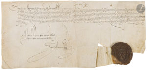 CHARLES IX (1550-1574). Acte en son nom, signée par Thielement, Paris 25 février 1570 ; vélin in-plano, sceau de cire brune aux fleurs de lys.