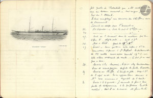personnel de navigation en Méditerranée et en Grèce, sur le croiseur la Gloire puis l’éclaireur Atmah, de mai 1915 à novembre 1917. Il est illustré de 13 croquis à l’encre ou au crayon, dont un représentant le croiseur avec ses pièces d’artillerie (p. 23), et d’une carte postale montrant l’Atmah (J. Geiser, photographe à Alger). C’est un intéressant témoignage sur les patrouilles en Méditerranée lors de la Première Guerre mondiale.