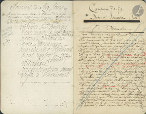 décembre 1870, au bivouac d’Argent-sur-Sauldre (Cher), et s’achève le 14 janvier 1871, lors de l’arrivée à Saulnot (Haute-Saône). Le texte, d’une écriture cursive, mais lisible, a été biffé au crayon bleu jusqu’à la p. 85. Chaque page contient un court résumé qui a été écrit en surcharge, perpendiculairement au texte.