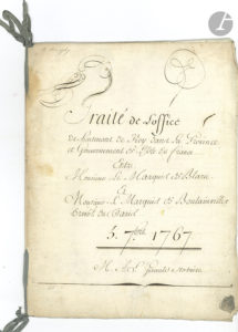 ÎLE DE FRANCE. Acte notarié (expédition signée par les notaires), Paris 5 septembre 1767-15 décembre 1768 ; cahier in-4 de 12 pages sur parchemin, couverture de papier, le tout lié d’un ruban bleu, cachets fiscaux.