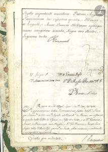 Cession du régime fiscal des villes d’Ursini, Tissi et Ossi au marquis de Moras. La signature du roi est suivie de signatures de chancellerie, et de l’exequatur.