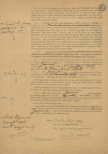 7 mars 1927. Traité particulier entre Marcel Ballot, agent de la Société des Auteurs et Compositeurs dramatiques, représentant Jules Romains, et Jouvet, directeur de la Comédie des Champs-Élysées, autorisant Jouvet à représenter l’ouvrage de Jules Romains intitulé Knock, en France, Belgique, Suisse et tous les pays en langue française. Jouvet devra « verser chaque jour pour les représentations de la pièce […] le droit en argent de huit pour cent sur la recette nette »… À la fin, la signature est précédée de cette apostille autographe : « lu et approuvé bon pour engagement ». [Jouvet dut signer ce contrat pour la tournée qu’il s’apprêtait à faire en Belgique du 30 mai au 19 juin 1927 avec Knock de Jules Romains et Au grand large de Sutton Vane.]