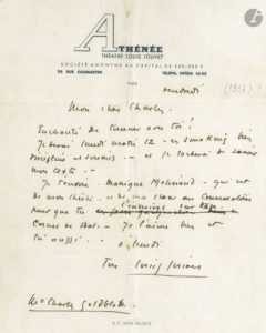 Louis JOUVET. 2 L.A.S., Vendredi [1937 ?], à Charles Goldblatt ; 2 pages et quart petit in-4 à en-tête de l’Athénée Théâtre Louis Jouvet, une enveloppe.