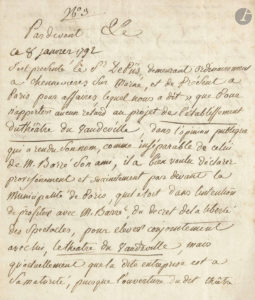 projet de l’établissement du théâtre du vaudeville, dans l’opinion publique qui a rendu son nom, comme inséparable de celui de M. Barré son ami, il a bien voulu déclarer provisoirement et succinctement par devant la Municipalité de Paris, quil étoit dans l’intention de profiter avec M. Barré du décret de la liberté des spectacles, pour élever conjointement avec lui, le théâtre du Vaudeville », qui ouvrira le lendemain. Il précise qu’il n’a pas l’intention de diriger ce théâtre ni aucun autre, et que sa coopération se limitera aux œuvres qu’il pourrait y faire jouer…