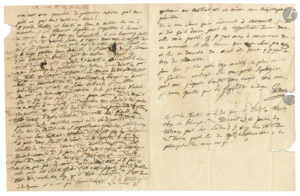 Puis Talma parle de sa sœur et de proches… Il ajoute qu’il a appris par Forbin que Ducis était « à Fleury chez la princesse de Talmont où tu faisois des tableaux pour son salon. Si tu y vois Mr le Duc de Duras parle lui de moi relativement à la prolongation de mon congé ».