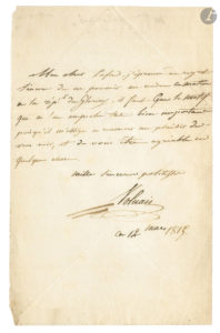 On joint une L.A.S. de Thérèse Bourgoin (1781-1833), au sujet de démarches auprès d’un duc pour obtenir le remboursement de sa part et l’augmentation de sa pension [après sa retraite, 1829] (1 p. ¼ in-8).