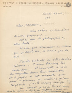 Jean-Louis BARRAULT. 15 L.A.S., 1950-1970, à Henry de Montherlant ; 25 pages formats divers (la plupart in-4), dont une carte postale et une en partie dactyl., plusieurs en-têtes de la Compagnie-Madeleine Renaud-Jean-Louis Barrault, de l’Odéon...