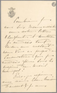 [1907-1908]. « Combien je vous suis reconnaissante pour votre lettre si confiante et si courtoise. Je voudrais tant causer un instant avec vous à propos du Conservatoire pour ce que je voudrais faire sous les auspices du Conseil municipal ! » [Elle fut professeur au Conservatoire de février 1907 à juin 1908].