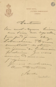 Sarah BERNHARDT. L.A.S. « Sarah », Londres, à un docteur ; 1 page in-8 à vignette et en-tête du Savoy Hotel.